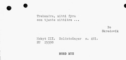 //// Trehundra, nitti fyra som tjente nittitre ... //// ' Bo Skredsvik //// Mskpt III. Soldatsånger s. 481-EU 25398 //// mBB MUS ////