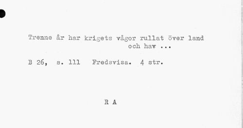 //// > //// Trenne år har krigets vågor rullat över land //// och hav ..• //// B 26, s. 111 Fredsvisa. 4 str. //// R A ////