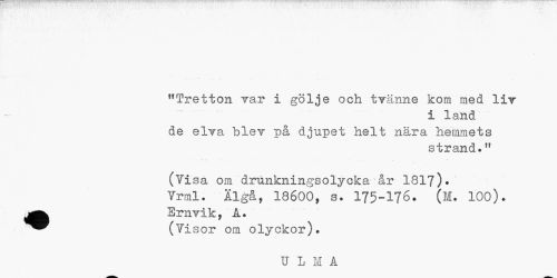 //// "Tretton var i gölje och tvänne kom med liv //// i land //// de elva blev på djupet helt nära hemmets //// strand.n //// (Visa om drunkningsolycka år 1817)* Yrml. Algå, 18600, s. 175-176. (M. 100). Ernvik, A. //// ^^ (Visor om olyckor). //// U L M A ////