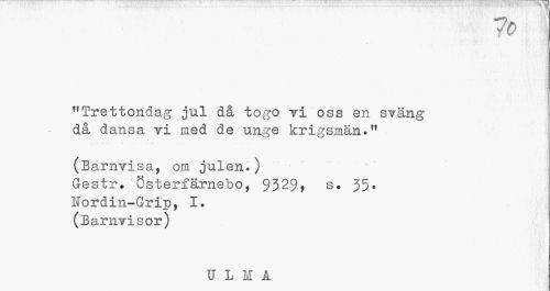 //// ?0 //// "Trettondag jul då togo vi oss en sväng då dansa vi ined de unge krigsmän." //// (Barnvisa, om julen.)- //// Gestr. Österfärnebo, 9329, s. 35- //// Nordin-Grip, I. //// (Barnvisor) //// U L M A ////