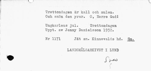 //// Trettondagen är kall och mulen. Och snön den yrar. 0, Herre Gud! //// Ungkarlens jul. Trettondagen //// Uppt. av Jenny Danielsson 1932. //// Hr 1171 Jät sn. Kinnevalds hd. Sm. //// LA1TDSMÅLSAEKIVET I LUND //// t ////