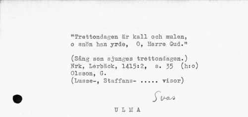 //// "Trettondagen är kall och mulen, o snön han yrde, 0, Herre Gud." //// (Sång som sjunges/trettondagen.) Nrk, Lerbäck, 14-15*2, s. 35 (h:o) Olsson, G. //// (Lusse-, Staffans- ... visor) //// U L M A ////