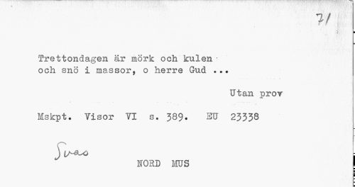 //// ¦ //// Trettondagen är mörk och kulen * och snö i massor, o herre Gud ... //// • • . SJ W //// Utan pror //// • ? • * //// Mskpt. Tisor 71 s. 389. EU 23338 //// \ Ih^o - //// FORD MS //// ¦ ////