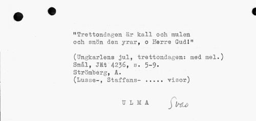 //// "Trettondagen är kall och mulen och snön den yrar, o Herre Gudl" //// (Ungkarlens jul, trettondagen: med mel.) Smål, Jät * 4236, s. 5-9. Strömberg, A. //// (Lusse-, Staffans- ... visor) //// U L M A ////