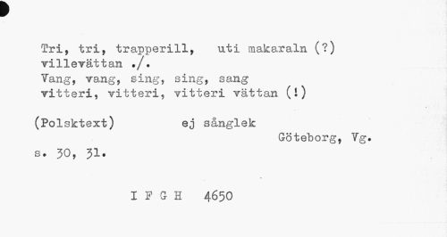 //// Tri, tri, trapperill, uti makaraln (?) //// rillerättan •/. //// Tang, rang, sing, bing, sang //// vitteri, Titteri, vitteri rattan (!) //// (Polsktext) ej sånglek //// Göteborg, Vg. //// s» 30, 31# //// IPGH 4650 ////