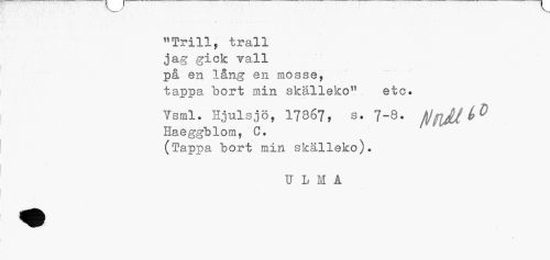 //// "Trill, trall //// jag gick vall //// på en lång en mosse, //// tappa "bort min skälleko" etc. //// Tsml. Hjulsjö, 17867, s. 7-8. f\JflK^D //// Ilaeggblom, C. //// (Tappa bort min skälleko). //// Ulli ////
