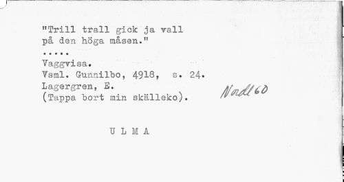 //// t1Trill trall gick ja Tall f //// på den höga masen.11 J //// Vaggvisa* //// •1 //// Vsml. Gunnilbo, 4918* s. 24* //// Lagergren, £. /l/oJ/td //// (Tappa bort min skälleko). : - //// TJ L M A ////