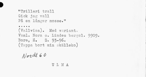 //// w //// "Trilleri trall //// Gick jag vall //// På en 1ånger mosse." //// I //// (Yallvisa). Med variant* I //// Ysml. Iföra o. Lindes bergsl. 99^9* //// Bore, E. S. 93-96. j //// (Tappa bort min skälleko) //// i i //// i t //// A<> o //// f //// ULMA //// 4 ////