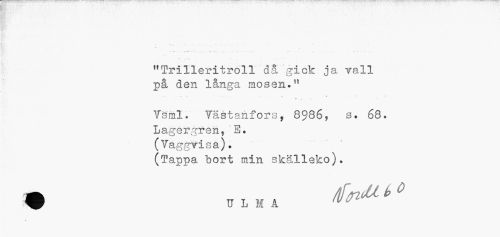//// "Trilleritröll då gick ja vall //// på den långa mosen." //// ... .. :. .. .. :. - ? //// i , //// Tsml* Väétanfors, 8986, s. 68. //// Lagergren, E. //// (Vaggvisa)» //// (Tappa bort min skälleko). • U L M A fa"'" ////