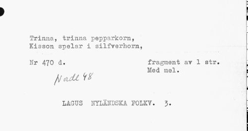 //// Trirrna, trinna pepparkorn, Kisson spelar i silfyerhorn, //// Ur 470 d. fragment av 1 str. . //// Med mel. 1 //// jsJtidLL W //// ii //// LAGUS HYLÄNDSKA FOLKV. 3. ! //// ¦ ////