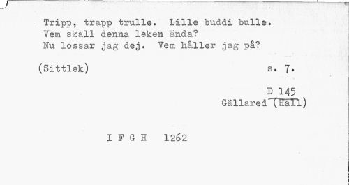 //// — ... - ... . ... . . A //// I //// Tripp, trapp trulle. Lille "buddi bulle. j //// Vem skall denna leken ända? //// Nu lossar jag dej. Vem håller jag på? //// * —¦ //// ...I //// (Sittlek) s. 7. //// » //// D 145 //// GällaredT^äll) //// I F G H 1262 //// I //// > ////