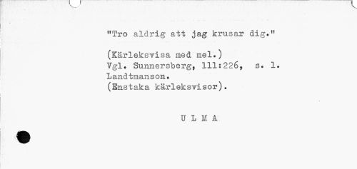 //// "Tro aldrig att jag krusar dig." //// (Kärleksvisä med mel.) //// Vgl. Sunnersberg, 111:226, s. 1. //// Landtmanson. //// (Enstaka kärleksvisor). //// ULIA ////
