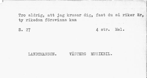 //// Tro aldrig, att jag krusar dig, fast du så riter är, ty rikedom försvinna kan //// • . " l T ... t //// ¦ / S. 27 4 str. Mel. //// . A1 //// LANDTMÅIISON. YASTBRG MUSIKBIL. ////