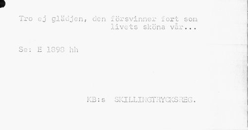 //// w //// Tro ej glädjen, den försvinner fort son //// livets sköna vår... //// Se: E 1890 hh //// KB:s SKILLINGTRYCKSREG. //// • • ...-...I ////