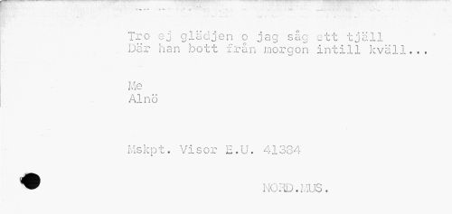 //// r^ , • - • * --- . ... ... //// • . //// Tro ej glädjen o jag såg ett tjäll //// Där han bott från morgon intill kväll... //// Me //// Alnö //// Mskpt. Visor E.U. 41384 //// NO HD. MUS . ////