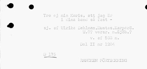 //// Tro ej ni n Kor is, a 11 jag är //// i dina band så fast - //// ^^ sj . af Ulrika Dahlman,Mus-tas JCarperö . //// 17.0? versr. n.Sjöb.? //// f //// ' « ol sj o j i i. i • //// Del II nr 1204 //// D 176 //// ' RANCKEN FÖRTECKNING ////