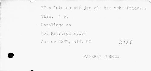 //// "Tro inte du att jag går här och- friar... //// Vis a. 4 v. //// Harplinge sn i. //// T"\ r* -—» r-s t • • ^ i a //// xie x . r r. o t rom s . i 54 //// Acc.nr 4388, sid. 50 "t) /3 é //// 9 VARBERG MUS EUM ////