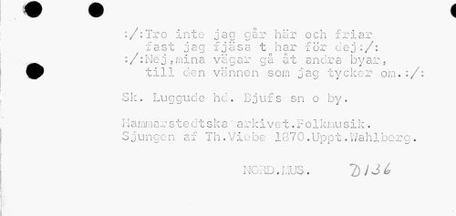 //// w w //// :/:Tro inte jag går här och friar fast jag fjäsa t har för dej:/: ^ :/:Nej,mina vägar gå åt andra byar , //// fp till den vännen som jag tycker om.:/: //// Sk. Luggucle hd. Bjufs sn o by. //// Hammarstedt skavarkive t.Folkmusik. Sjungen af Th.Viebe 1870.Uppt.Wahlberg. //// NORD. LUS . 2) / J ^ ////