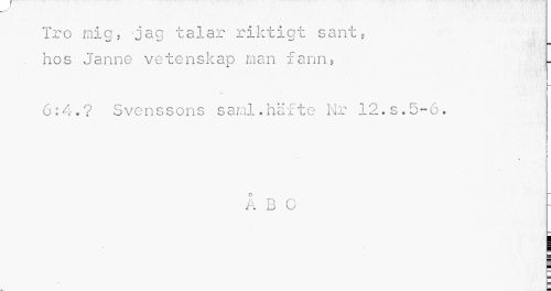 //// Tro mig, jag talar riktigt sant, . hos Janne vetenskap man fann, //// 6:4.? Svenssons saml.häfte Nr 12.s.5-6. //// k B C - ////