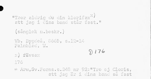 //// I //// v ) //// Hlror a lurig du din klonf ax'v/ att jag i dina band står fast.." //// (sånglek rn. be skr.) //// Vb. Byg de å , 8 66 5. s.12-14 //// i ii *» t >. f o rn h o c Tri //// i CX J„ i i 1 J-J C% 5 i V • //// 9W7& //// , v y a V o o , v //// 176 //// = Arw,Sv.Forns.s,348 nr 92:"Tro ej Cloris, //// att jag är i dina band så fast ////