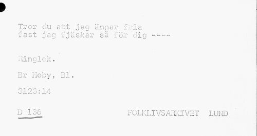//// p //// Tror ou att jag ämnar fria //// w O //// fast jae fjäskar sa för dig — I lin elek. //// w' //// Br KoSoy , Bl. //// O 1 O c 1 //// D 136 FOLKLIVSARKIVET LUND ////
