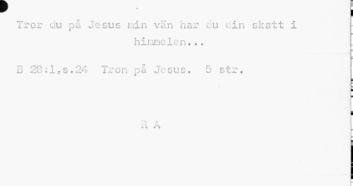 //// I //// Tror du på Jesus min vän har du din skatt i //// himmelen..« //// B 28:1,s.24 Tron på Jesus. 5 str. //// i i //// P A //// i l H //// m ////