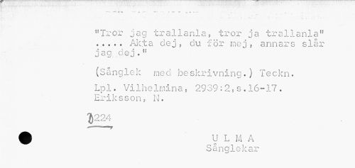 //// • v* -5. ^ — iX r* mU i» ** ^ 0 f T- //// " " * •• r 1 * //// • , . . ... . ';•. «... .. ^ , * i •-, . //// "Tror jag trallania, tror ja trallania11 ... Akta dej, du för mej, annars slår jag; dej . " //// (Sånglek med beskrivning.) Teckn. //// Lpl. Vilhelmina, 2939:2,s.16-17. Eriksson, N. //// $224 //// Sånglekar ////