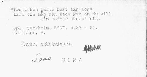 //// "Truls han gifte bort sin Lona till sin måg han sade Per om du vill //// min dotter skona" etc. //// Upl. Veckholm, 6997, s.33 - 34. Karlsson, S. //// (Nyare skämtvisor). l . J U. L M A //// »¦ //// s ¦ ////