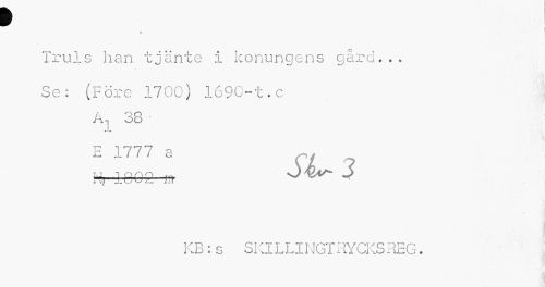 //// 9 //// i //// « //// Truls han tjänte i konungens gård... Se: (F öre 1700) 1690-t.c //// A Q O . J-\ i JU //// F 1777 q //// XIII a ^ //// itj 1002 ).! ° ^ ^ //// KB : s SKILLI NGT RYCKS REG. //// : ////