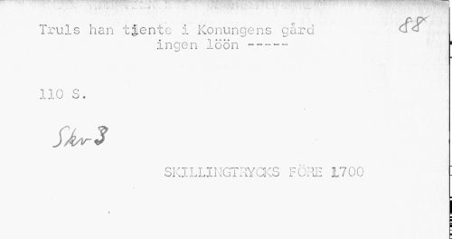 //// Truls han tjente i Konungens gård <fa //// ingen löön---1 //// 110 S. //// SKILLINGTRYCKS FÖRE 1700 : //// ¦ ////