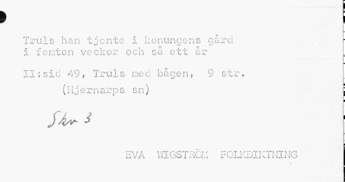 //// > ; //// Truls han tjente i konungens gård ]¦ //// i femton veckor och så ett år //// II: sid 49? Truls med bågen? 9 str. //// (Hjernarps sn) j //// i //// Sfa 3 //// ¦ //// EVA WIGSTROM FOLKDIKTNING ////