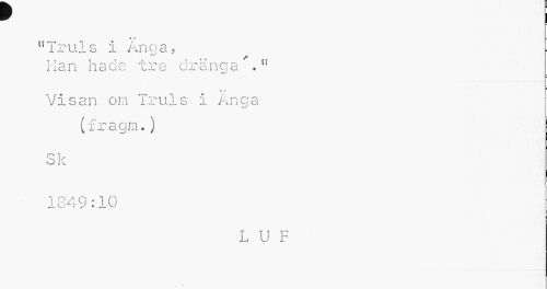 //// r //// < * //// "Truls i Ånga, //// Han hade tre dränga'." //// € ti //// Visan om Truls i Anga (fragrn.) //// Sk //// 1849:10 //// L U F ////