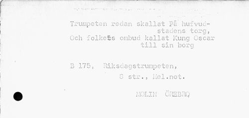 //// Trumpeten redan skallat på hufvuc- //// stadens torg, Och folkets ombud kallat Kung Oscar //// till sin borg //// / //// B 175, Riksdaqstrumpeten, //// ' ^ i 9 //// i //// 8 str., i .'le 1. n o t« 0 i.lCLH: GREBRQ ////