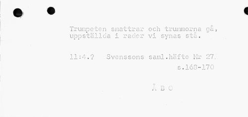 //// ? //// Trumpeten smattrar och trummorna gå, i 0 —' //// uppställda i rader vi synas sta. //// 11:4.? Svenssons saml.häfte Nr 271 //// s. 168-170 //// o //// b O ////