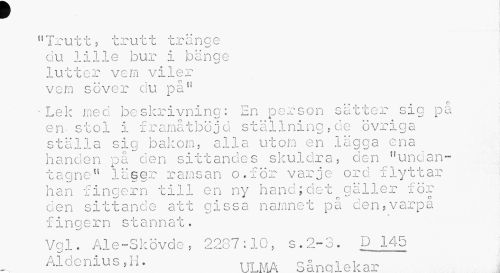 //// K //// w //// "Trutt? trutt tränqe du lille bur i bange lutter vem viler vem sover du på" //// -Lek med beskrivnino: En person sätter sia på //// ^ X w' i. //// en- stol i framatböjo ställning?de övriga ställa sig bakom, alla utom en lägga ena handen på den sittandes skuldra? den "undan-tagne" läser ramsan o.för varje ord flyttar han fingern till en ny hand;det gäller för //// o o //// den sittande att gissa namnet pä cen,varpa fingern stannat. //// Vgl. Ale-Skövde, 2287:10, s.2-3. D 145 Aldenius ,H. UT... n» nlo, r ////