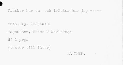 //// 9 //// Träskor har du, och träskor har jag --- //// insp.Htj. 14384=100 //// i\I a g nu s s o n, F r a n s V. K a r 1 s k o c a //// Ej i prgr //// (texter till låtar) //// RA INSP. ////