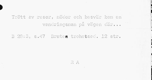 //// i //// Trött av resor, mödor och besvär kom en //// vandringsman på vägen där... //// i //// > //// B 28:3, s.47 Bruten trohetsed. 12 str. i //// ¦ //// D A A 1 J"i //// ¦ ////