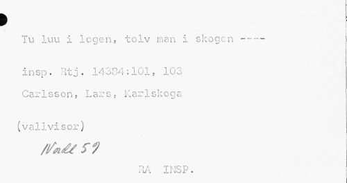 //// > //// r __ ; //// Tu luu i logen? tolv man I skogen --- //// insp. Htj. 14334:101, 103 Carlsson, Lars, Karlskoga //// »v' //// (vallvisor) //// RA INSP. ////