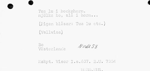 //// Tua lu-i bockahorn, mjölka ko, slå i horn... //// (Pigan biåsar: lua lu etc.) //// (Vallvisa) //// V cl b Lt.ä. JL d 11L. o; //// Mskpt. Visor I.s.637. H.U. 7334 //// NOi-lD. i ..TUS . ////
