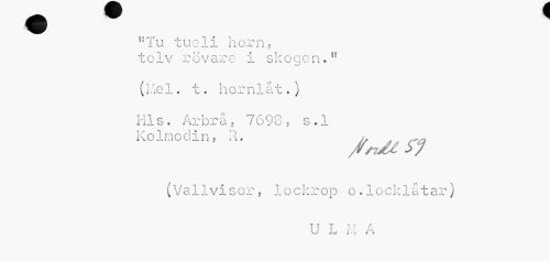 //// "Tu tueli horn, //// tolv rövare i skogen." //// (rAel. t. hornlåt.) //// Hls. Arbrå, 7698 , s . 1 //// Kolmodin, R. j, . //// (Vallvisor, lockrop o.locklåtar) //// U L M A ////