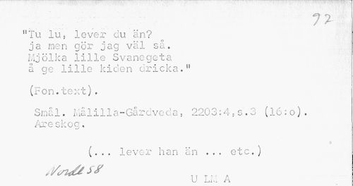 //// 1% //// V... r. «.«?. — J- -V •- • ' • » --W i. f .. ¦ . //// "Tu lu, lever du än? ja men gör jag väl så. Mj ö1ka 111le S v aneg e t a å ge lille kiden dricka." //// (Fen.text). //// Små 1. Må lilla-Går dve cl a , 220 3:4, s . 3 (16: o) . Are skog. //// $ //// (... lever han än ... etc.) //// n T i " A //// O liivi /i ////