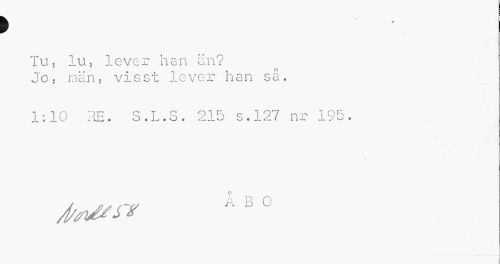 //// > //// Tu, lu, lever han än? //// Jo, män, visst lever han så. //// 1:10 RE. S.L.S. 215 s.127 nr 195. //// A/své/y* Å B 0 ////