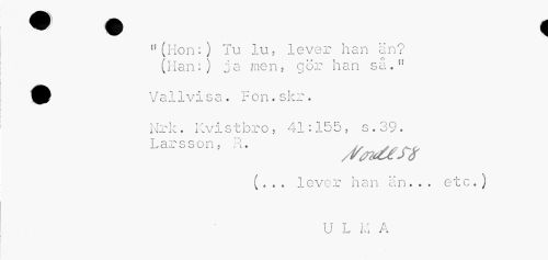 //// "(Hon:) Tu lu, lever han än? (Han:) ja men, gör han så." //// W Vallvisa. Fon.skr. //// Nr k . I .vist bro , 41:155, s . 39. Larsson , rl» ,, . //// (. . . lever han än... etc.) //// U L M A ////