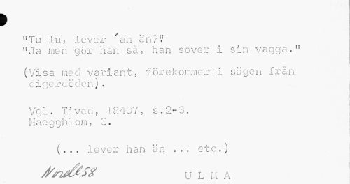 //// I //// »Tu lu» lever 'an än?V //// »Ja men gör han så, han sover i sin vagga." //// w/ //// (Visa med variant, förekommer i sägen från o i q e r d o d e n) . //// i //// V c; 1. Tive c:. 18407 , s.2-3. Haeggblom, C. //// (. . . lever han än ... etc.j //// Afrjfif* U L M A ////