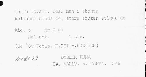//// i //// Tu lu lovall, Tolf man i skogen , j1 //// Ballhund binda de, store stuten stinga de //// Sid. 5 Nr 2 e) //// Mel.not. 1 str. I //// i //// (Se "Sv.Forns. D.III s ..503-505) //// i //// /Ifffl&l DYBECK RUNA //// SÄ. VALLV. o. HONRL. 1846 j ////