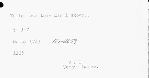 //// 9 //// Tu lu love tolv man i skoge... //// C i — //// 0 • --- //// Dalby (VI) //^fSj //// 1 1 o R //// J. J- O v^ //// V F F //// Vaqqv. barnv. ////