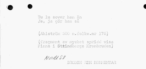 //// f-i-n -i \ • • //// lu lu sover han an Ja. ja göt han så //// (Ahlström 300 n.folkv.nr 176} //// (fragment av mycket spridd visa Finns i Sttindbergs Kronbruden) //// A/cnd/Sf //// BRODIN RIM KOMMENTAR ////