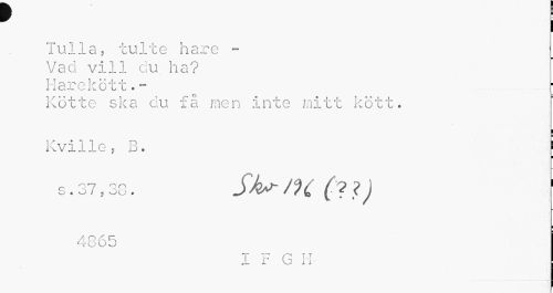//// ' i //// Tulla, tulte hare - //// ¦ //// Vad vill du. ha? Harekött.- //// Kötte ska du få men inte mitt kött. //// Kville, B. ! //// ¦ //// s.37,38. SJ^ nc (? ,?) //// 4865 //// 1 F G H ////