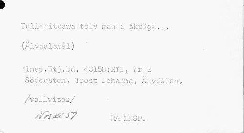 //// Tullerituawa tolv raan I skuäqa... (Älvdalsmål) //// insp•Rtj.bd. 43158:XII, nr 3 Södersten? Tröst Johanna, Älvdalen, //// ¦ //// /vallvisor/ //// afaavsj ra i msp. ////
