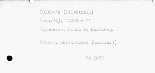 //// Tulaleja (Polsktrall) insp.Rtj. 14384 = 91 Magnusson, Frans V. Karlskoga //// (fra gm. o best ämbar a (tra11ar)) ////